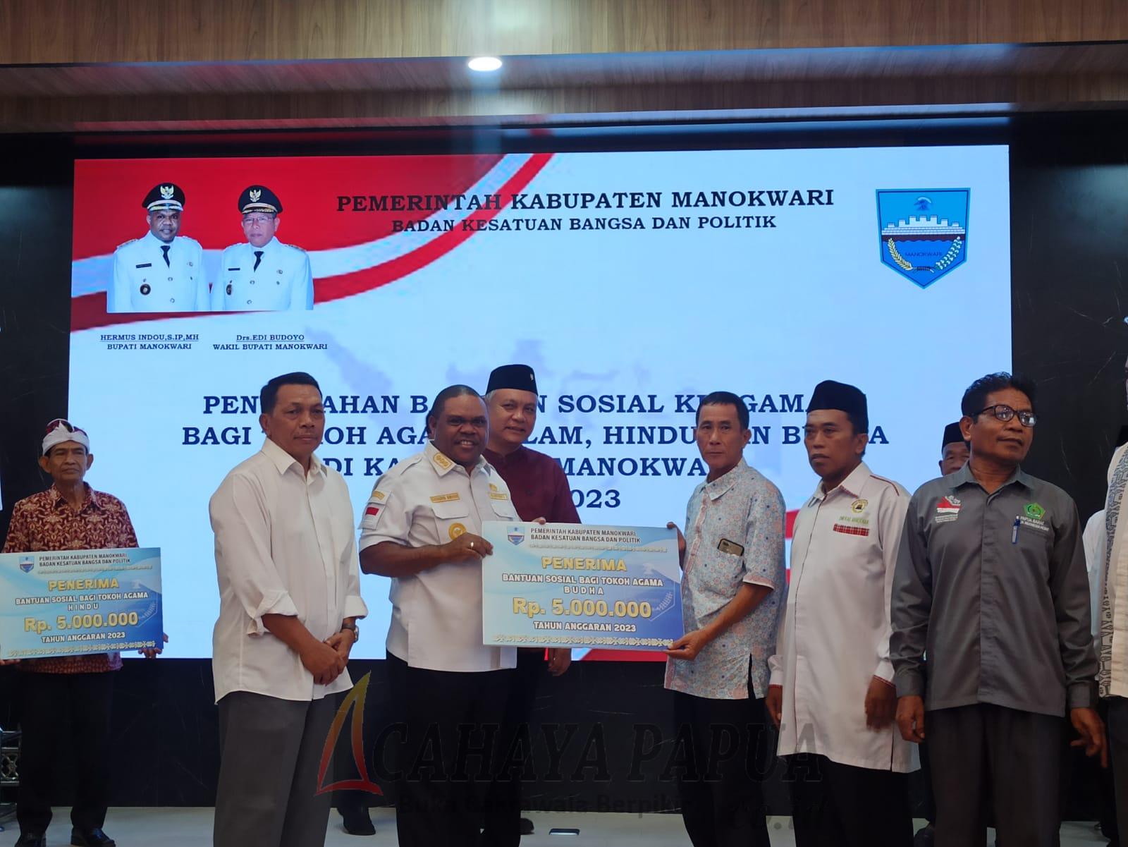 Mereka yang menerima bantuan antar lain dari tokoh agama Islam, Hindu, dan Budha. Bupati Hermus Indou mengatakan bantuan yang diberikan merupakan wujud apresiasi Pemkab Manokwari kepada tokoh agama yang sudah membantu Pemkab dalam melayani seluruh masyarakat