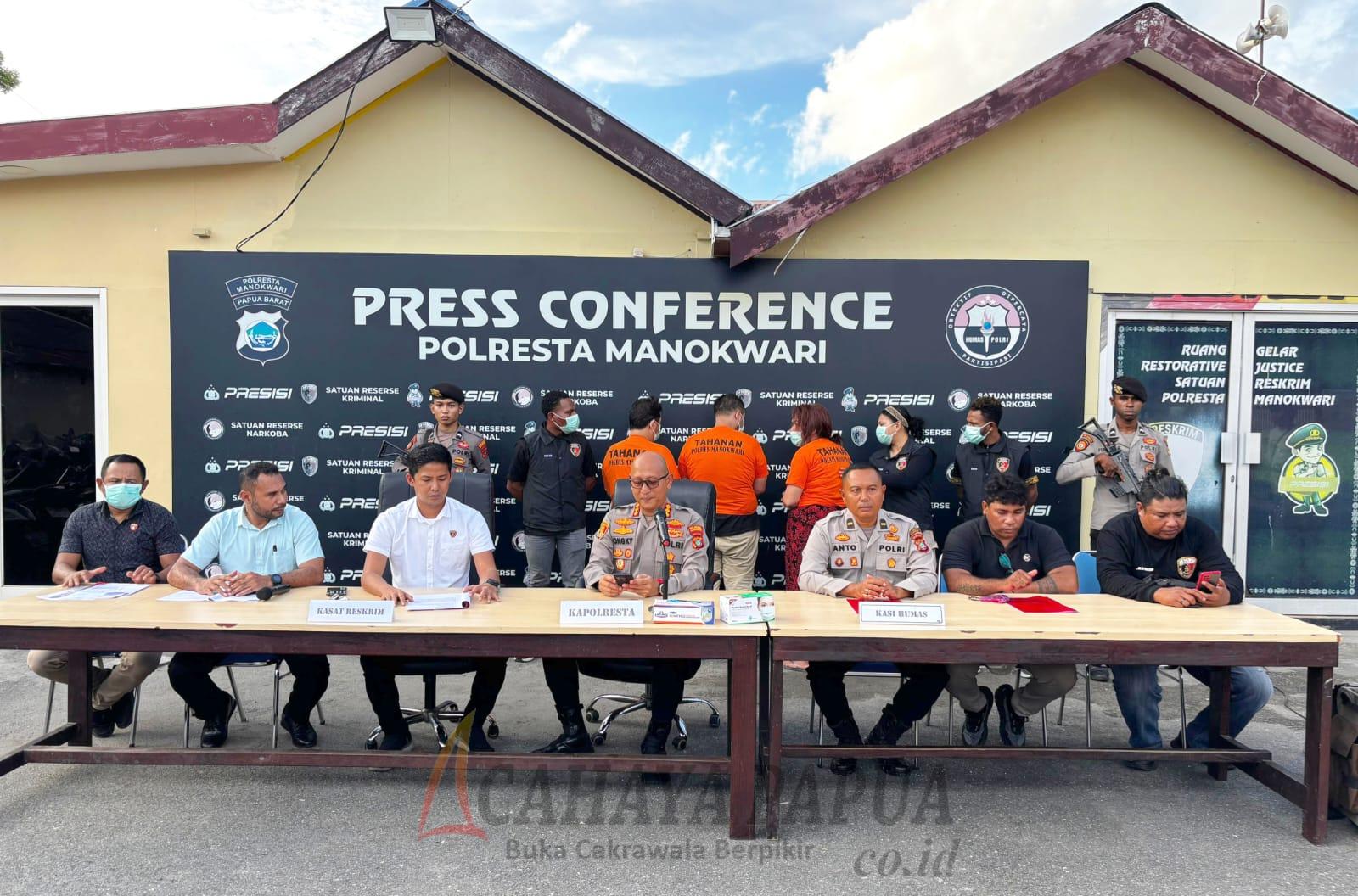 Kapolresta Manokwari Kombes Pol Ongky Isgunawan, didampingi Kasat Reskrim AKP Agung Gumara Samosir dan Kasi Humas IPDA Kiesman Ershi, memaparkan kronologi lengkap kasus tersebut dalam konferensi pers di Mapolresta Manokwari, Rabu (9/12/2025).