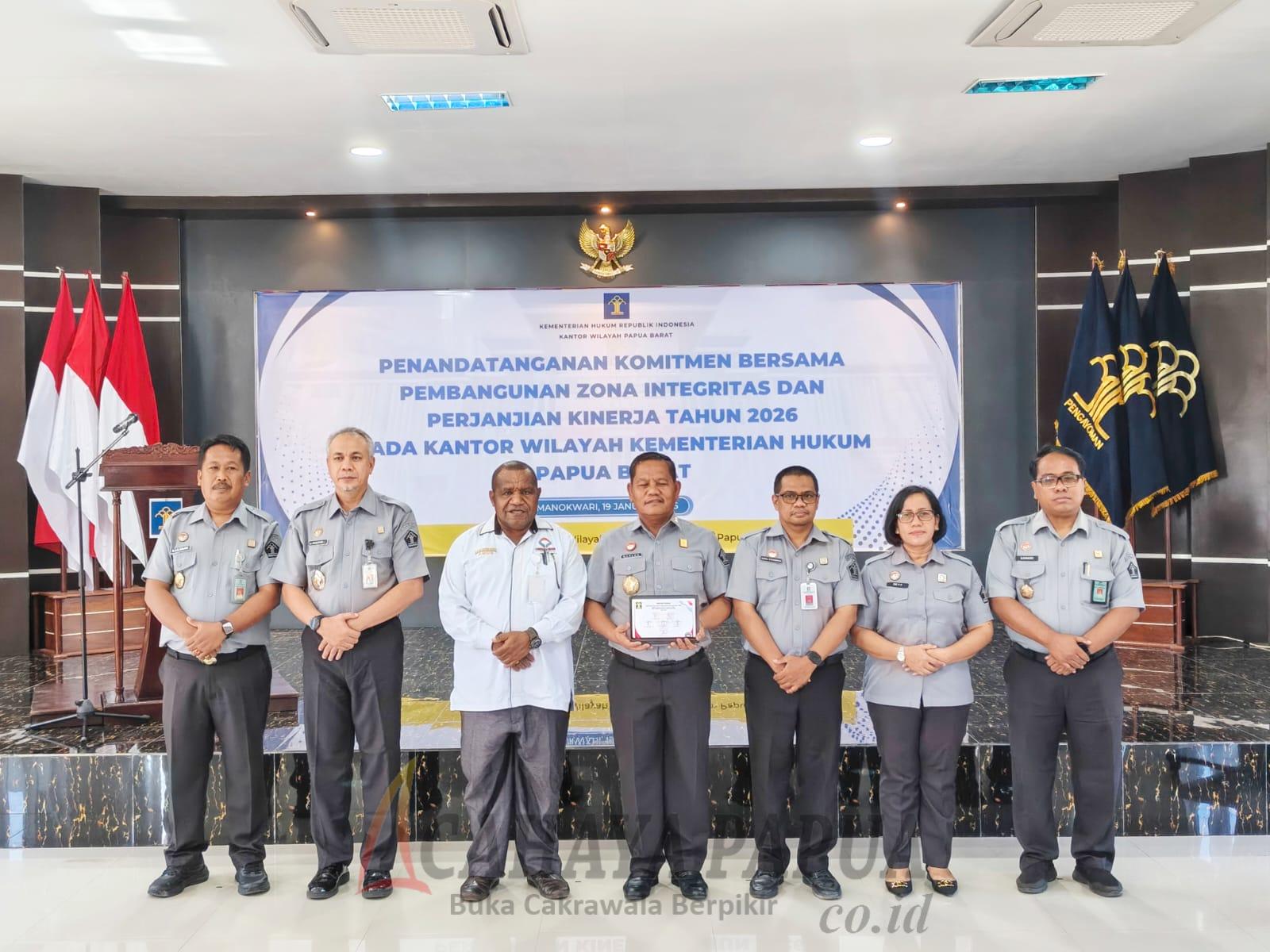 MANOKWARI, cahayapapua.id- Kantor Wilayah Kementerian Hukum (Kemenkum) Papua Barat melaksanakan penandatanganan komitmen bersama pembangunan Zona Integritas serta Perjanjian Kinerja Tahun 2026, sebagai wujud penguatan tata kelola birokrasi yang bersih, transparan, dan berorientasi pada pelayanan publik, di Manokwari, Senin (19/1/2026).