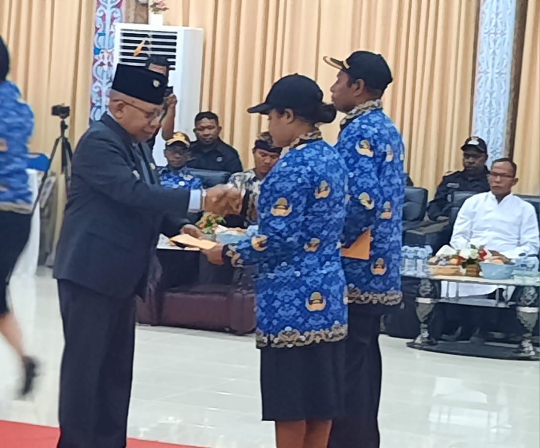 Prosesi pengangkatan ditandai dengan pengucapan sumpah janji dan penyerahan SK PNS oleh Bupati Hendrik Mambor di Gedung Sasana Karya, kompleks kantor bupati Teluk Wondama di Isei.