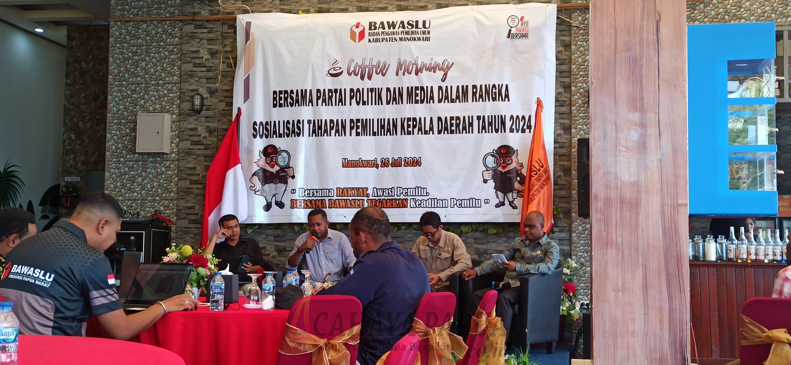 MANOKWARI, cahayapapua.id – Badan Pengawas Pemilihan Umum (Bawaslu) Kabupaten Manokwari menggelar coffee morning dalam rangka sosialisasi tahapan Pemilihan Kepala Daerah (Pilkada) 2024, Jumat (26/7/2924) di Hotel Oriestom By Manokawri. Coffe morning dihadiri kalangan parpol dan media massa.