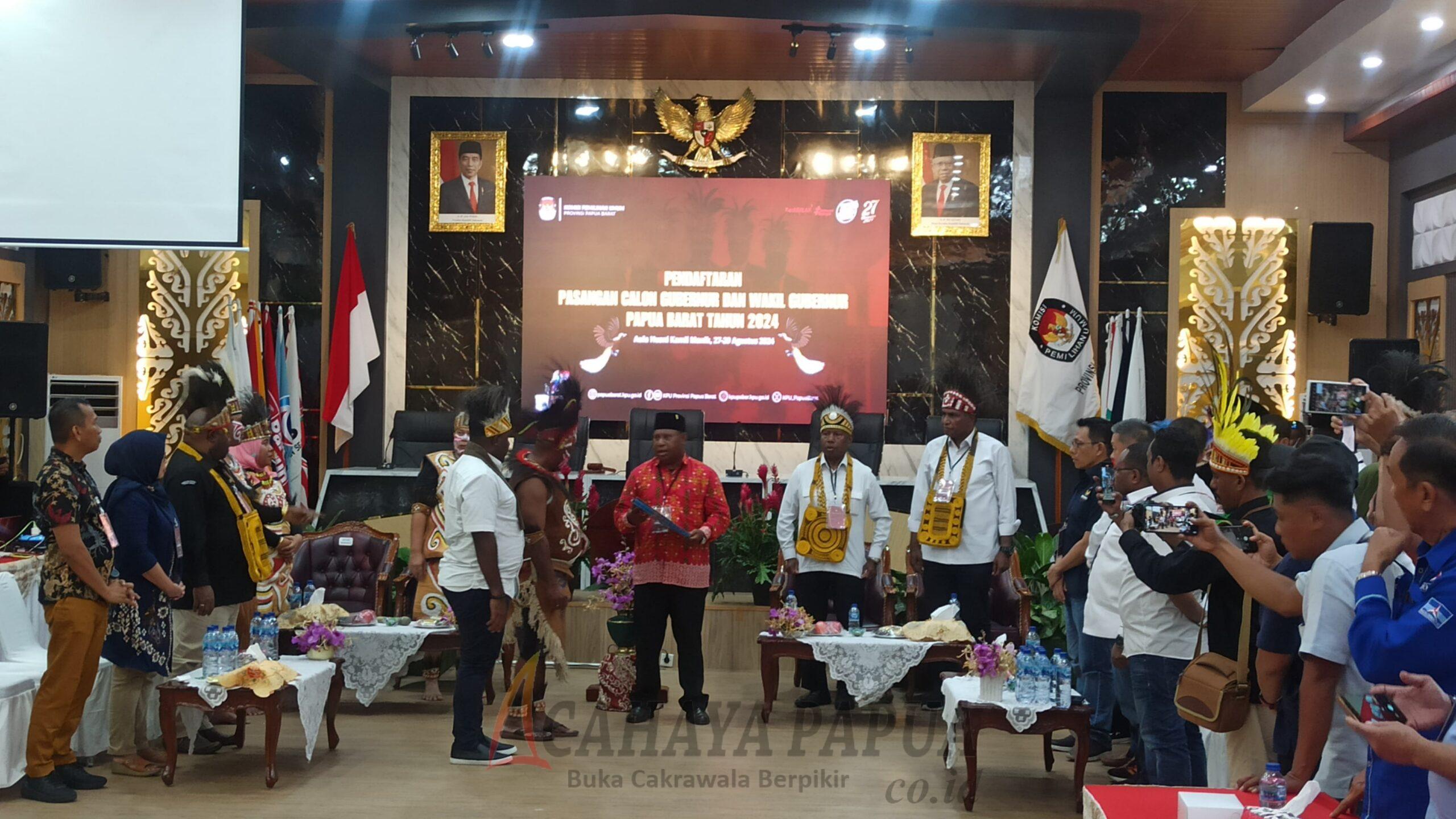 Tiba di KPU Papua Barat, pasangan DOAMU disambut dengan proses adat oleh Ketua KPU Provinsi Papua dilanjutkan dengan pengisian registrasi.
