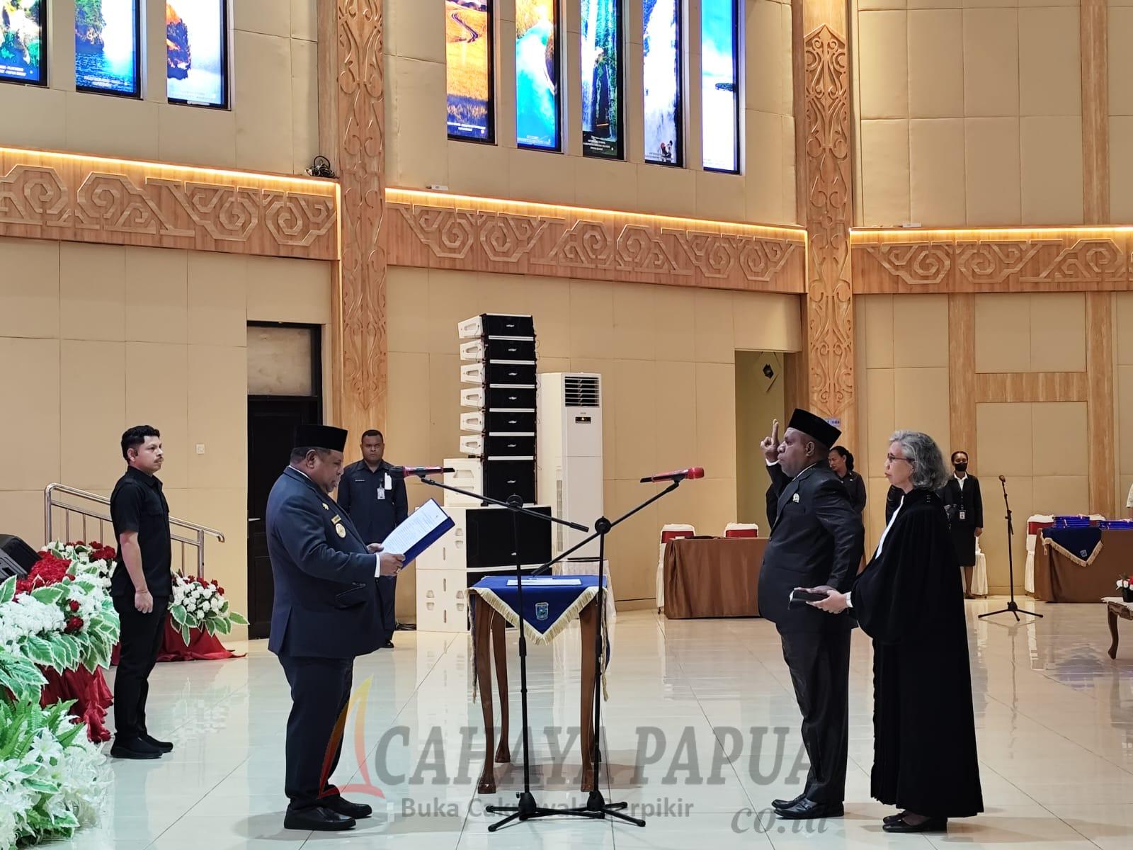 Pengambilan sumpah/janji jabatan dipimpin langsung oleh Pj. Gubernur Papua Barat, Ali Baham Temongmer, di Auditorium TP PKK Provinsi Papua Barat, Kamis (30/1/2025). Melbianus Mandacan dilantik untuk menggantikan Maxsi Nelson Ahoren yang telah mengundurkan diri pasca mengikuti kontestasi Pemilihan Kepala Daerah Tahun 2024.