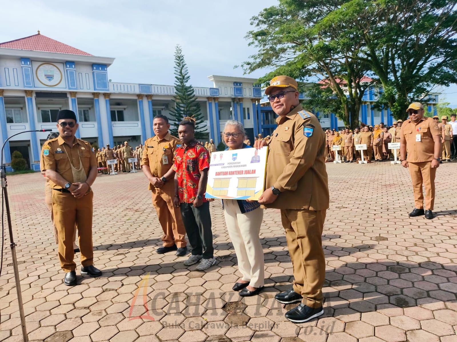 ‎Penyerahan bantuan dilakukan secara simbolis oleh Wakil Bupati Manokwari, H. Mugiyono bersama Sekretaris Daerah dan Pelaksana Harian Kepala Dinas Perindustrian dan Perdagangan (Disperindag) saat apel gabungan di lingkup Pemkab Manokwari, Senin (2/3/2026).