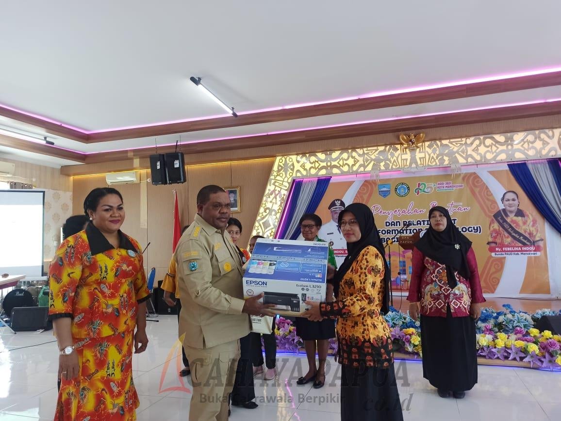 MANOKWARI, cahayapapua.id- Bupati Manokwari Hermus Indou bersama Bunda PAUD, Febelina Indou membuka pelatihan IT (Information Technology), Jumat (3/11/2023). Pelatihan juga diikuti penyerahan bantuan sarana IT kepada sejumlah lembaga.