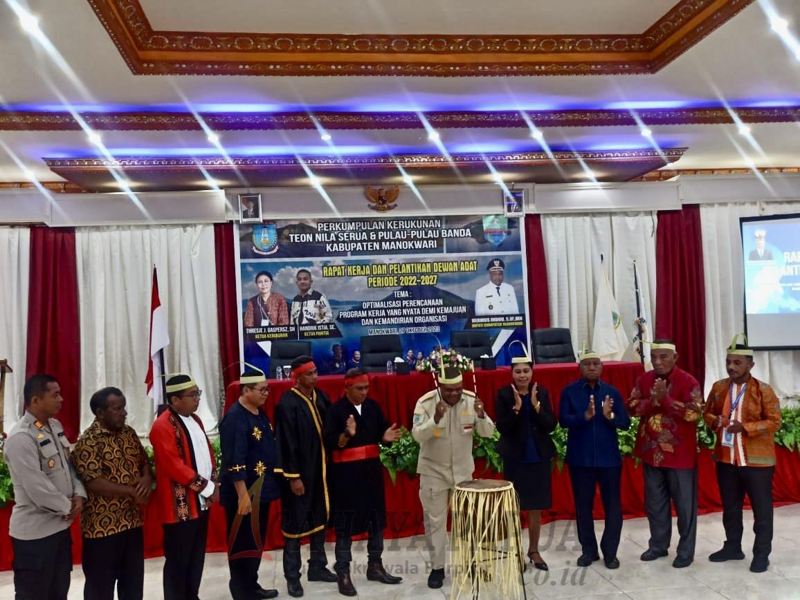 MANOKWARI, cahayapapua.id- Bupati Manokwari Hermus Indou membuka rapat kerja dan pelantikan Dewan Adat Kerukunan Teon Nila Serua (TNS) dan Pulau-pulau Banda, Kabupaten Manokwari, Jumat (27/10/2023). Hermus mengatakan, keberadaan warga TNS menunjukkan eratnya harmonisasi suku-suku di Manokwari.