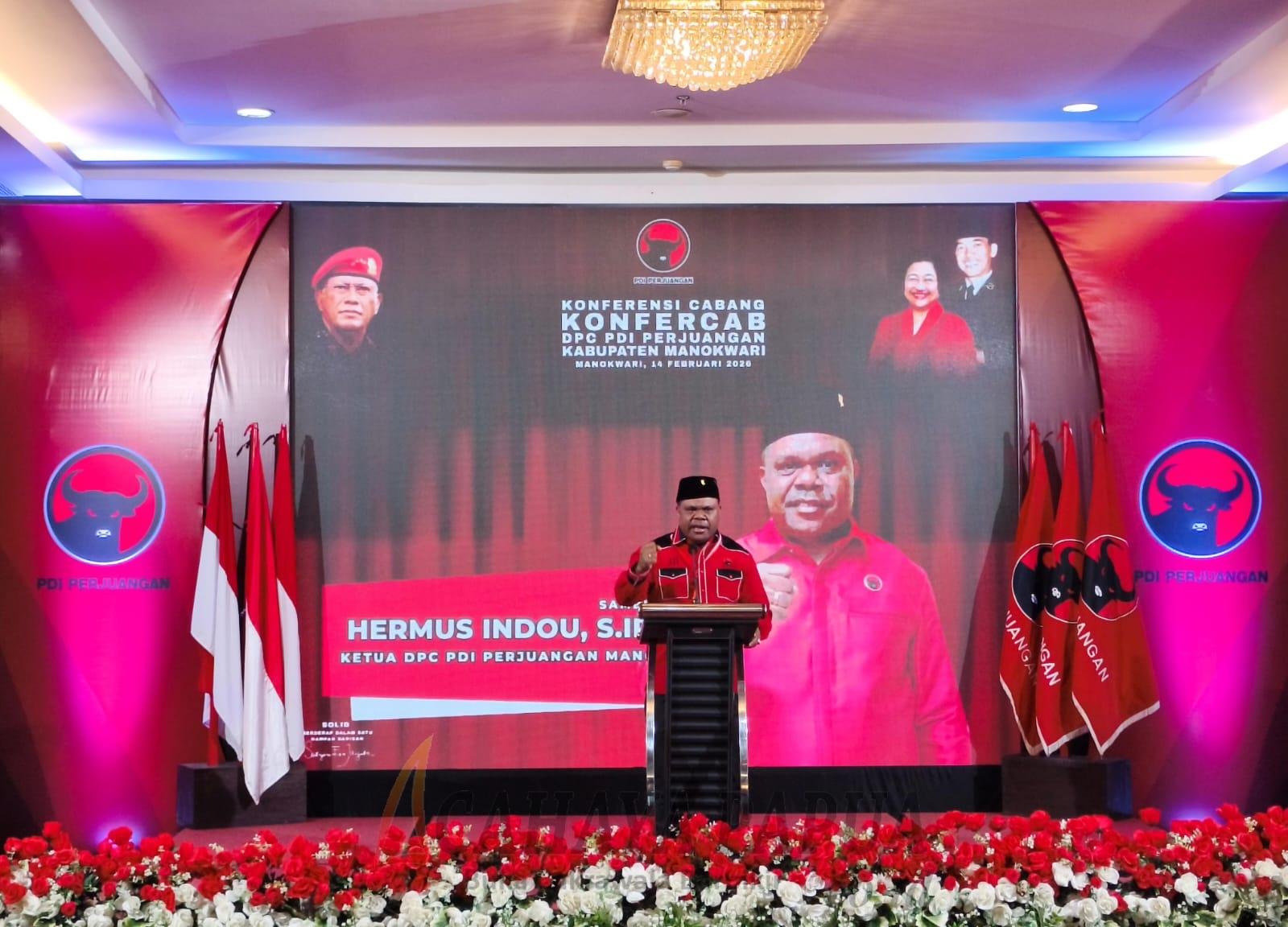MANOKWARI, cahayapapua.id- Ketua DPC PDI Perjuangan Kabupaten Manokwari, Hermus Indou, memaparkan capaian politik partai sekaligus menegaskan pentingnya menjaga soliditas dan stabilitas internal dalam Konferensi Cabang (Konfercab) DPC PDI Perjuangan Kabupaten Manokwari yang digelar, Sabtu (14/2/2026).