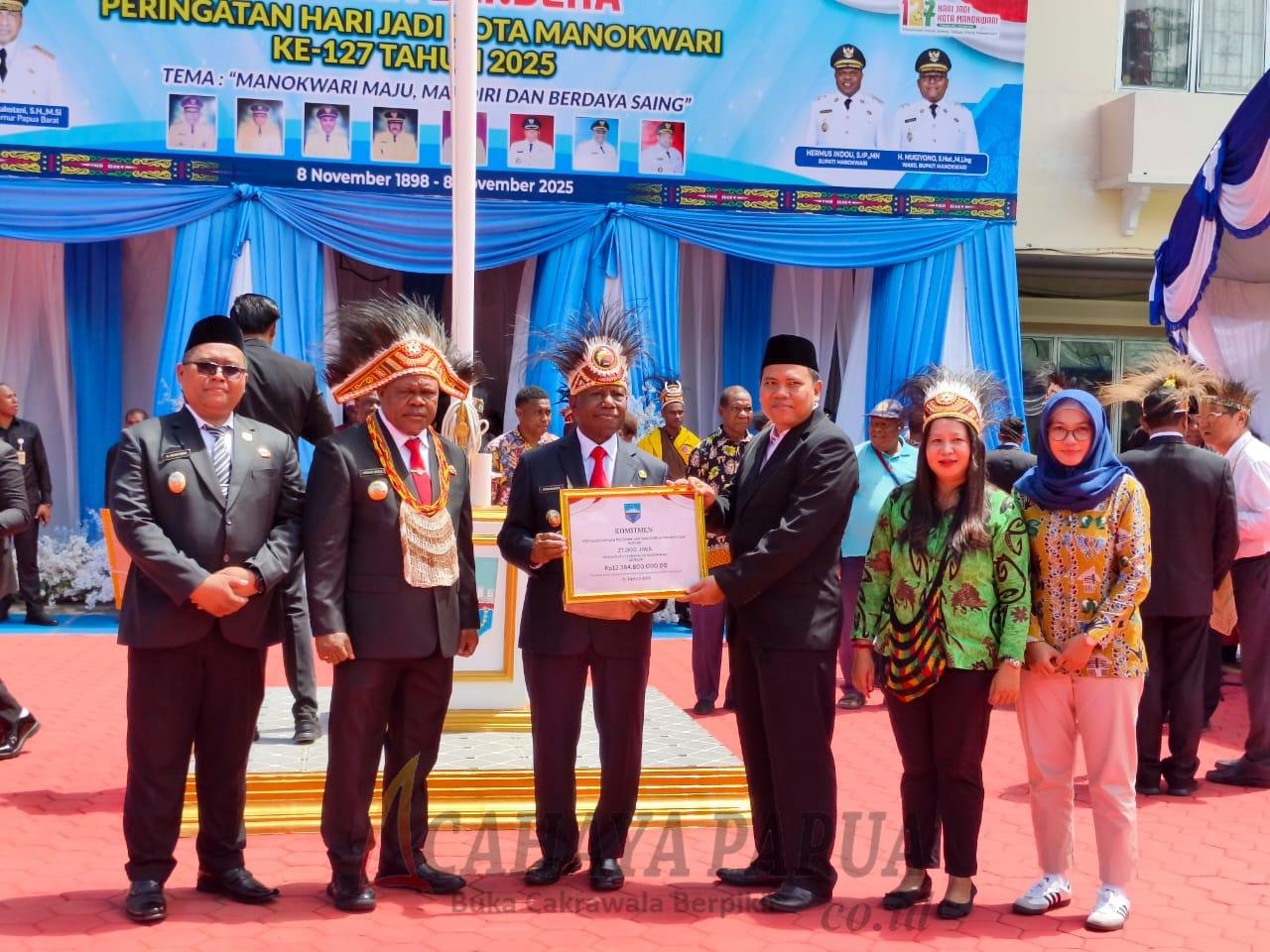 ‎Komitmen tersebut disampaikan Bupati Manokwari, Hermus Indou, saat penyerahan simbolis rencana kerja program Jamkesda tahun 2026 kepada BPJS Kesehatan Manokwari oleh Gubernur Papua Barat, Dominggus Mandacan, pada puncak peringatan HUT ke-127 Kabupaten Manokwari, Sabtu (8/11/2025).
